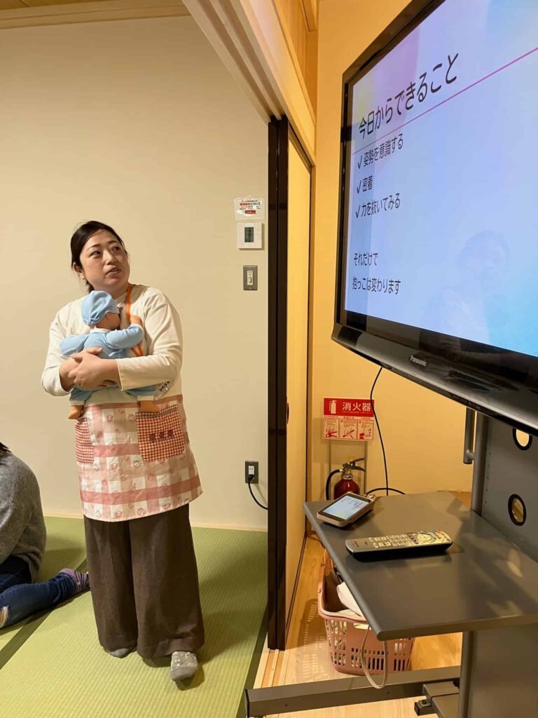 抱っこの講座は聞いている時間が長いと感じました!実際に皆さん立って実践してみましょう!という感じでみんなが抱っこしているのを講師の先生ができているか回ってみてもいいかなと考えました!