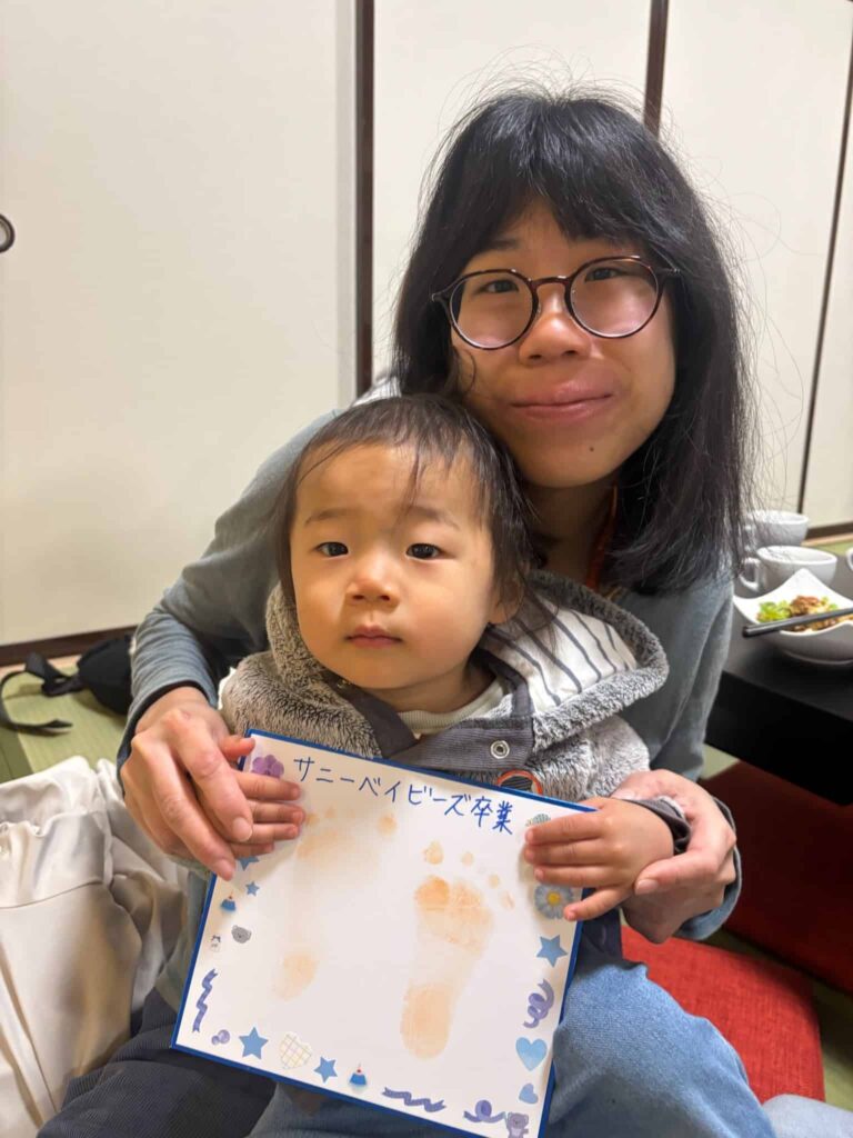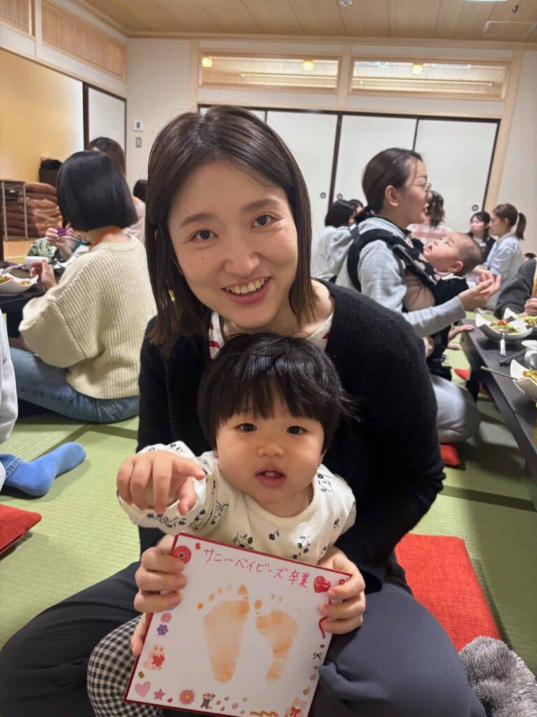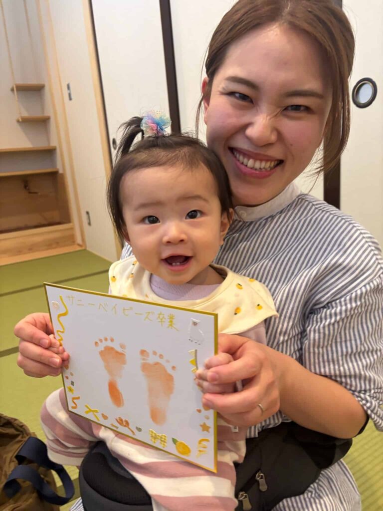 来月から慣らし保育が始まるため、今日で卒業でした✨ サニーベイビーズに参加できたのは、3回程度だったかな?と思いますが、 気持ち的には、このイベントがすごくリフレッシュになっていたなと思います☺️ お値段もすごく優しいのに、ためになる講座を聞けるのはもちろんのこと、お茶やおやつをいただけるのも魅力の一つでした。 孤独を感じやすい子育ての中で、ママ達や、助産師さんに、気兼ねなく相談できる環境があったのはとてもありがたかったです。 卒業、なんだか少し寂しさもありますが、いただいた足形を思い出に、これからも育児を楽しんでいけたらいいなと思います❣️