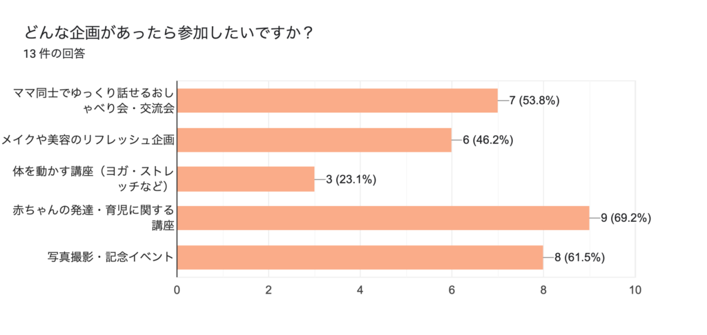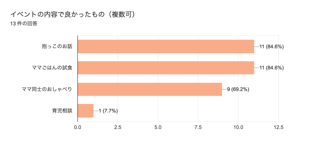いつも開催ありがとうございます。 ママたちとお話しできるのが自分にとって息抜きになり、また前向きな気持ちで育児をすることができます。 毎回違う内容で準備も大変だと思いますが、リトミックとかもあると嬉しいです。 今後もよろしくお願いします。